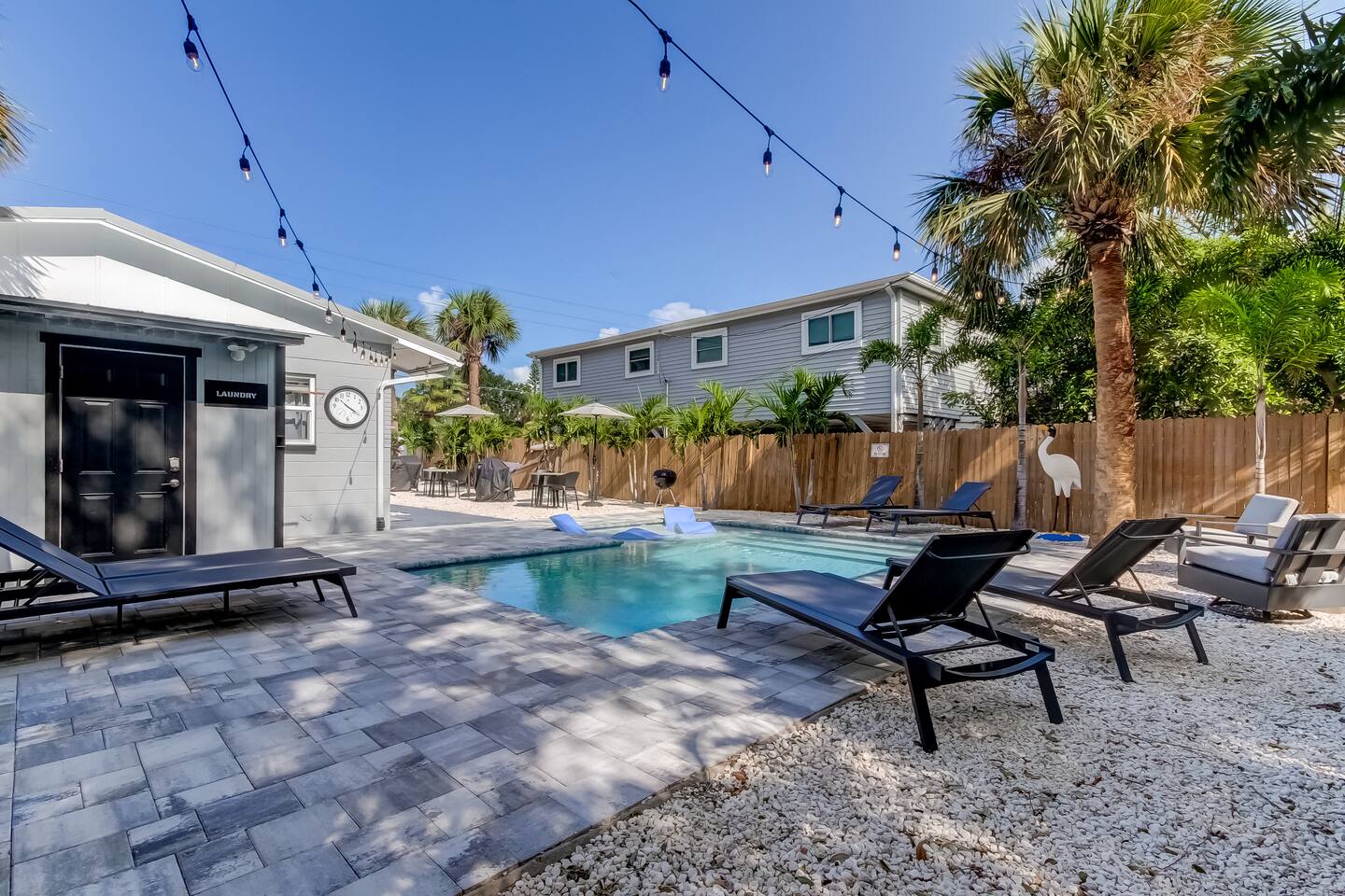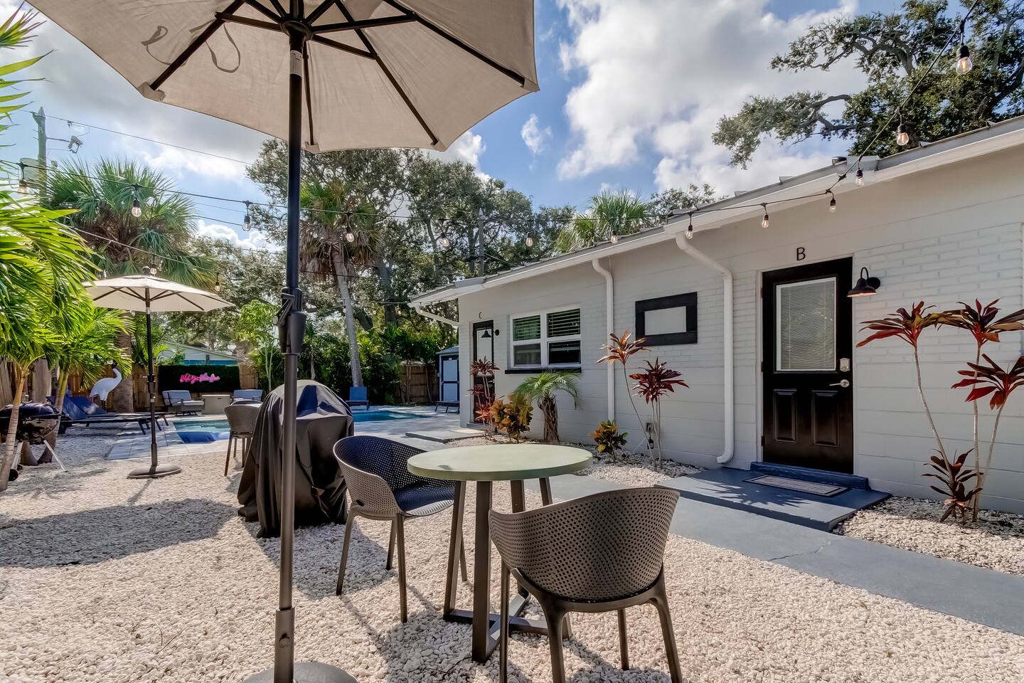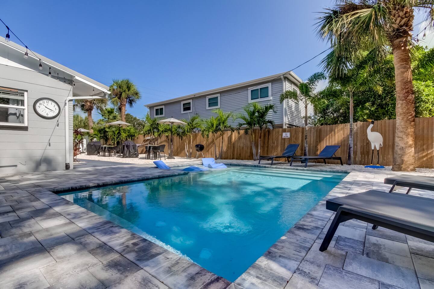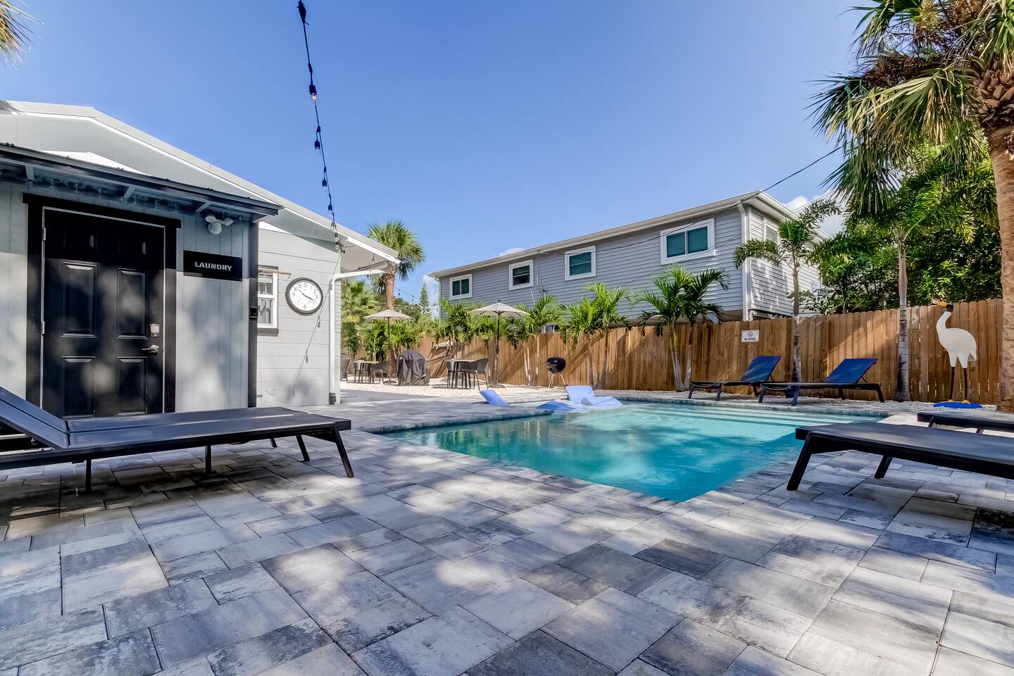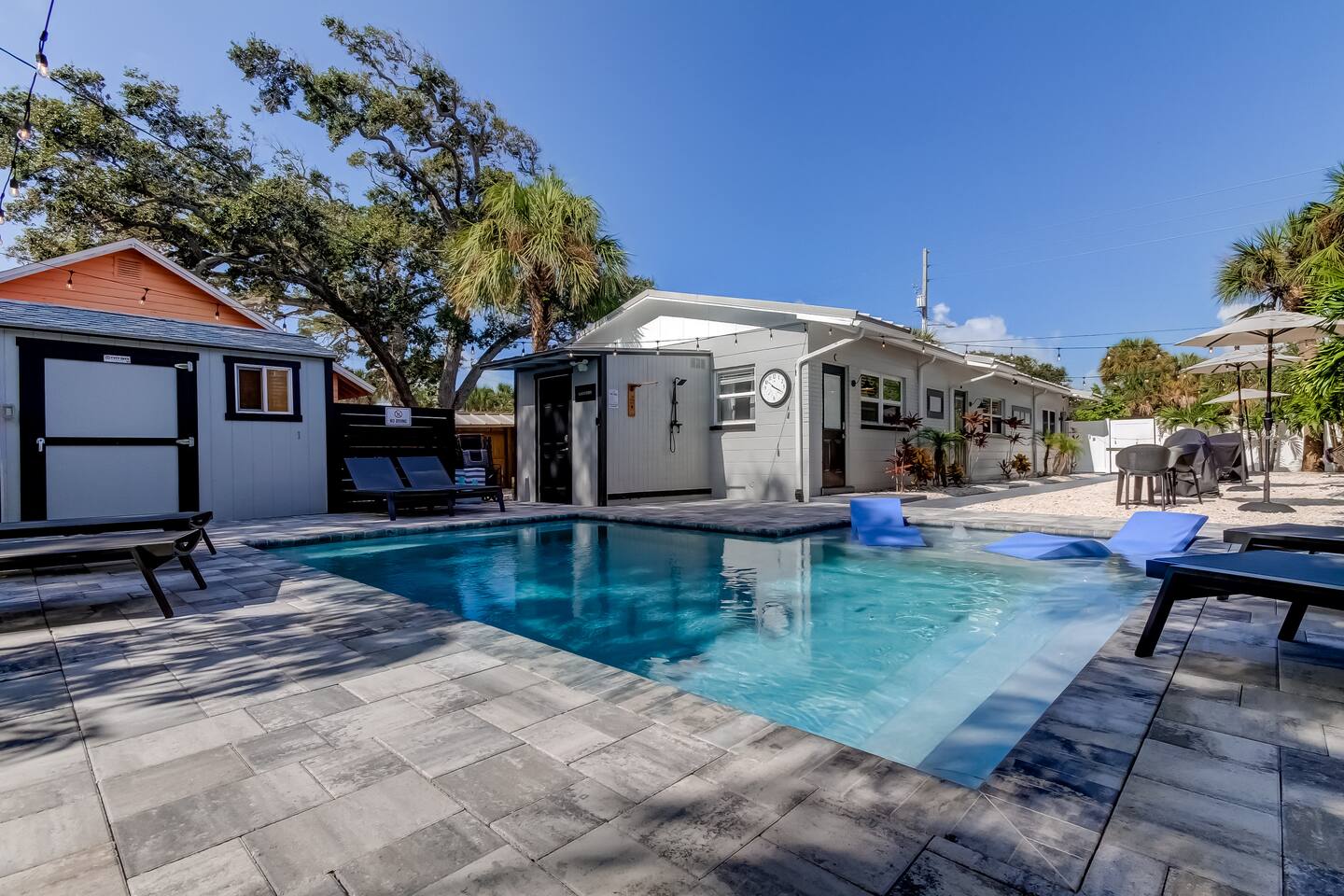 Welcome to the Jungle by My Hometown Hero Rentals Step into our serene and sunlit suite, where you'll be greeted by delightful decor that perfectly complements the stunning Indian Rocks Beach just a 2-min walk away. As one of three distinct suites, you have the option to book one, two, or all three to accommodate larger gatherings. The prime location allows you to easily stroll to an array of top-notch restaurants and charming shops in Indian Rocks Beach. Enjoy the beautiful pool, putt putt, lighted bocce ball, fire pit, and ring toss in your own back yard. This Indian Rocks Beach getaway showcases a blend of sleek leather and earthy tones to create a relaxing, modern ambiance. The stylish mid-century modern home features a leather futon, an inviting space to unwind after a day at the beach, while also providing additional sleeping accommodations for guests. The harmonious combination of contemporary furnishings and soothing color palettes is carefully curated to evoke a sense of tranquility and rejuvenation, further enhancing your memorable vacation experience. Need more than one suite? Check out our listing that includes all three adjacent suites in the triplex (sleeps up to 10)- Airbnb92700915392708842. We have two other uniquely decorated spaces- Suite B "Welcome to the Jungle" Airbnb53911426 and Suite C "Rockin Retreat" Airbnb53911427. KEY FEATURES: ☀ Brand new heated pool with sun shelf and chaise loungers (shared with 2 neighboring suites rather than an entire hotel) ☀ Easy access to the beach; just walk across the street! ☀ Fire pit with relaxing swivel lounge chairs ☀ Free Wi-Fi; Smart TVs ☀ Amazon Dots (speakers) with Unlimited Amazon Music ☀ Includes beach gear: wagons, zero gravity beach chairs, umbrellas, sand toys, beach speaker, and cooler ☀ Short walk to local seafood restaurants, shops + water sports rentals ☀ Fully stocked game closet ☀ 1 bedroom with a king-sized memory foam mattress + Smart TV ☀ 1 bathroom with shower/bath combo ☀ Fully-equipped kitchen; bistro-style table + workspace ☀ Cozy lounge with leather couch ☀ Fenced-in courtyard with outdoor seating, umbrellas, and BBQ grills (propane and charcoal) ☀ On-site laundry facility, free to use ☀ 2 suites with similar layout but custom decor next door 2 Min Walk to Indian Rocks Beach 2 Min Drive to Splash Harbour Water Park 20 Min Drive to Clearwater-St Pete Airport 40 Min Drive to Tampa International Airport Our fully-stocked, farmhouse-style kitchen truly sets this Airbnb apart, boasting brand new quartz countertops and all the essentials for crafting delicious home-cooked meals. With a wide array of spices, oil, and cookware on hand, you'll have everything you need to channel your inner chef. The stainless steel appliances, including a dishwasher, add a touch of luxury while ensuring you won't have to worry about doing dishes during your vacation. Outdoor relaxation is taken to a new level with our collection of comfortable swivel chairs and fire pit ensuring total comfort as you lounge in the coastal breeze. Challenge your travel companions to a friendly game of giant connect four or ring toss, adding an element of fun to your stay. After a sandy day at the beach, rinse off in the outdoor shower before enjoying a meal at one of our dining tables, shaded by umbrellas. Grill a fresh catch on one of the BBQ grills available for communal grilling (both gas and charcoal options). The bright bathroom features recent renovations, showcasing modern matte black fixtures and fresh tiling. You'll find both a bathtub and showerhead, as well as ample storage space for your belongings. Travel light and leave your worries behind, as we've provided plenty of beach towels, a hair dryer, and complimentary toiletries for your convenience. Step outside to discover the true gem of our vacation rental: the brand new splash pool with sun shelf surrounded by sleek chaise loungers. This unique feature not only provides a refreshing space to cool off but also adds an extra touch of luxury to your stay. The pool ensures comfort year-round, making it the perfect spot to unwind and soak up the Florida sun, no matter the season. The pool is shared between the three units rather than an entire hotel complex. With these exceptional amenities at your disposal, our Airbnb rental offers an unparalleled outdoor experience for your vacation getaway. When you decide to venture beyond the picturesque Indian Rocks Beach, you'll find a myriad of attractions and activities nearby to keep you entertained. Explore the stunning Florida Botanical Gardens, just a short drive away, where you can stroll through lush landscapes and discover local flora and fauna. For art enthusiasts, the Dali Museum in St. Petersburg offers a unique cultural experience, housing an extensive collection of Salvador Dali's works. If you're looking for an adrenaline rush, head to Busch Gardens Tampa Bay, where thrilling roller coasters and family-friendly rides await. For nature lovers, Caladesi Island State Park is the perfect destination to unwind and explore pristine beaches, mangroves, and nature trails. With so many attractions and activities to choose from, your stay at Indian Rocks Beach is bound to be a memorable experience filled with fun, relaxation, and adventure. Don't wait – book your stay today and uncover the beauty of Indian Rocks Beach and its surroundings!