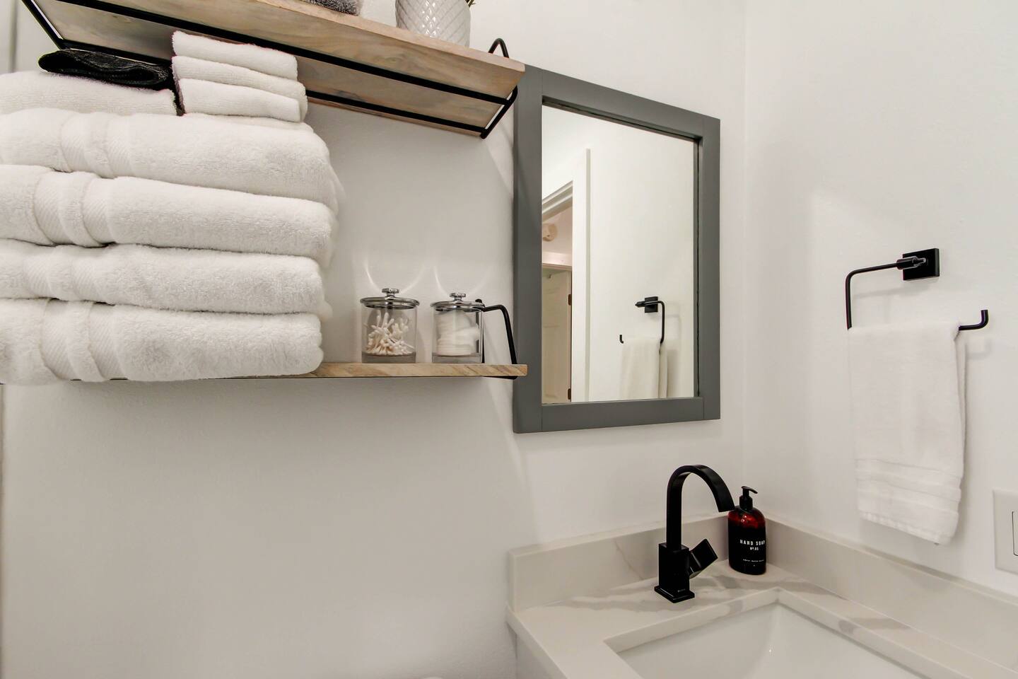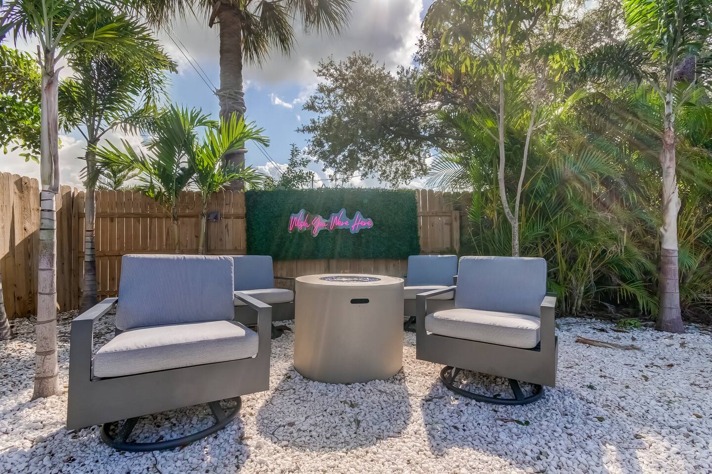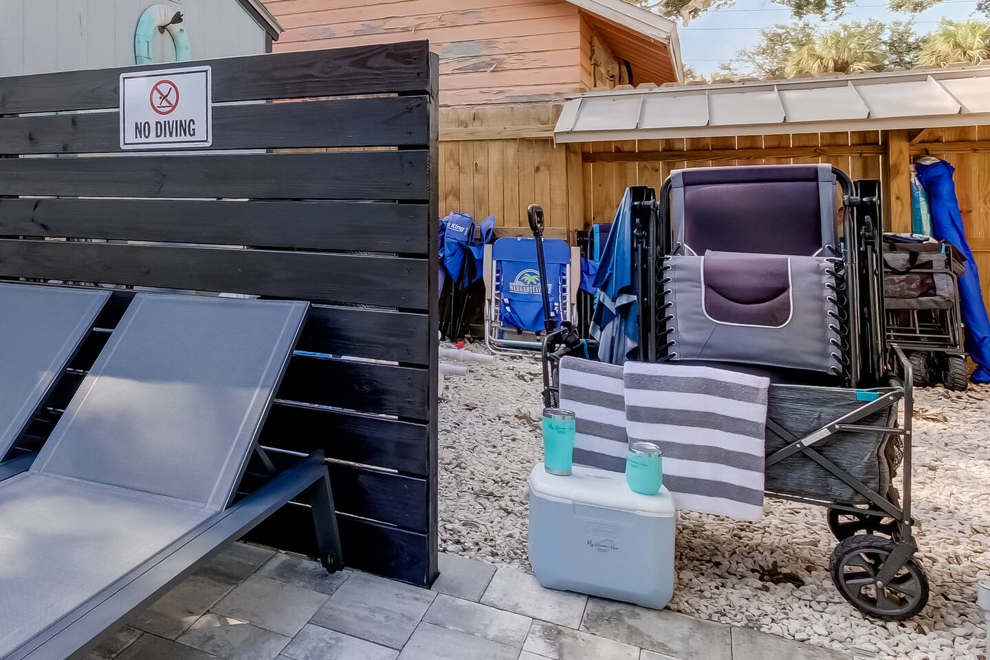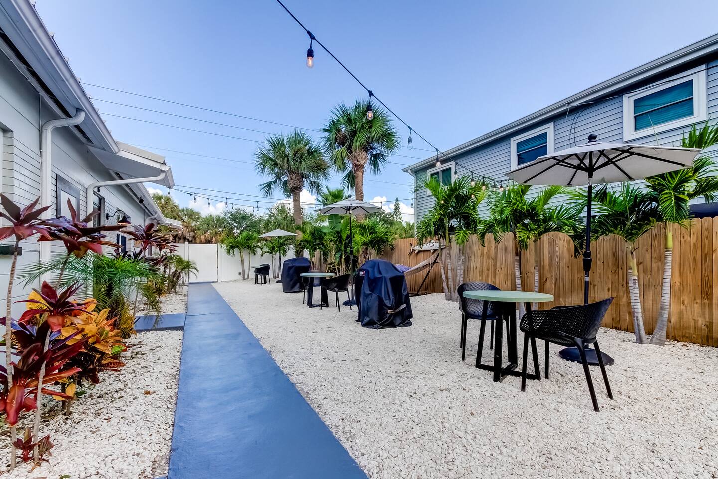 ☀ Easy access to the beach; just walk across the street! ☀ Stylish shared heated pool with sun shelf and chaise loungers ☀ Fire pit with relaxing swivel lounge chairs, bikes ☀ Beach wagons, zero gravity chairs, cooler, ice, umbrellas, towels, speakers ☀ 3 hole glow in the dark putt putt ☀ Amazon Dots with Unlimited Amazon Music ☀ Fenced-in courtyard w/ outdoor seating, umbrellas, and BBQ grills ☀ Triplex with 3 uniquely decorated suites- private interiors, shared exterior