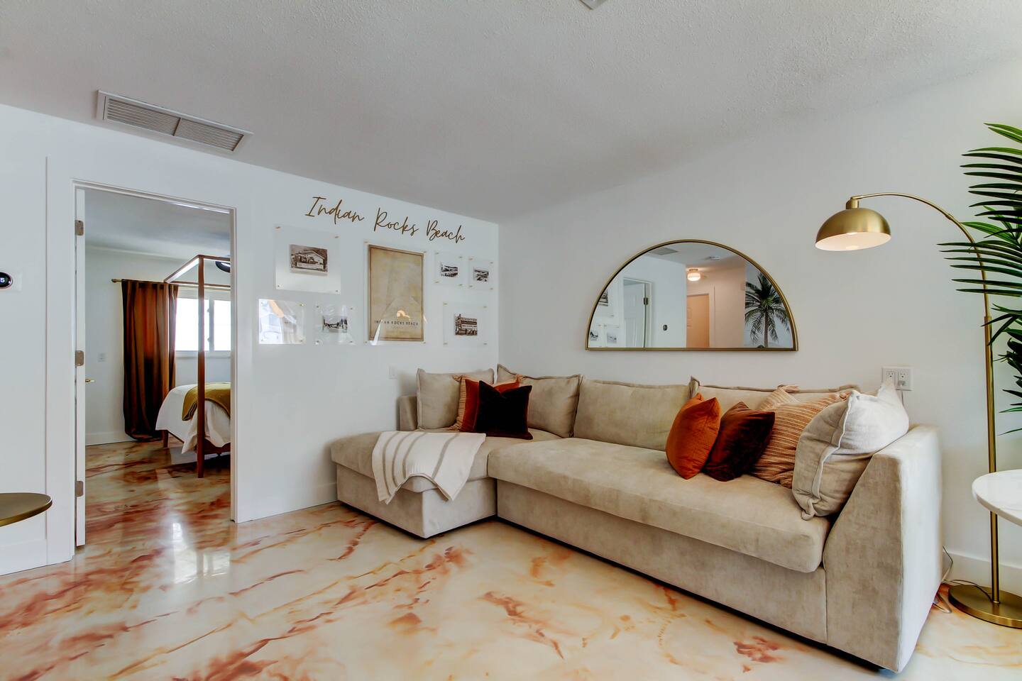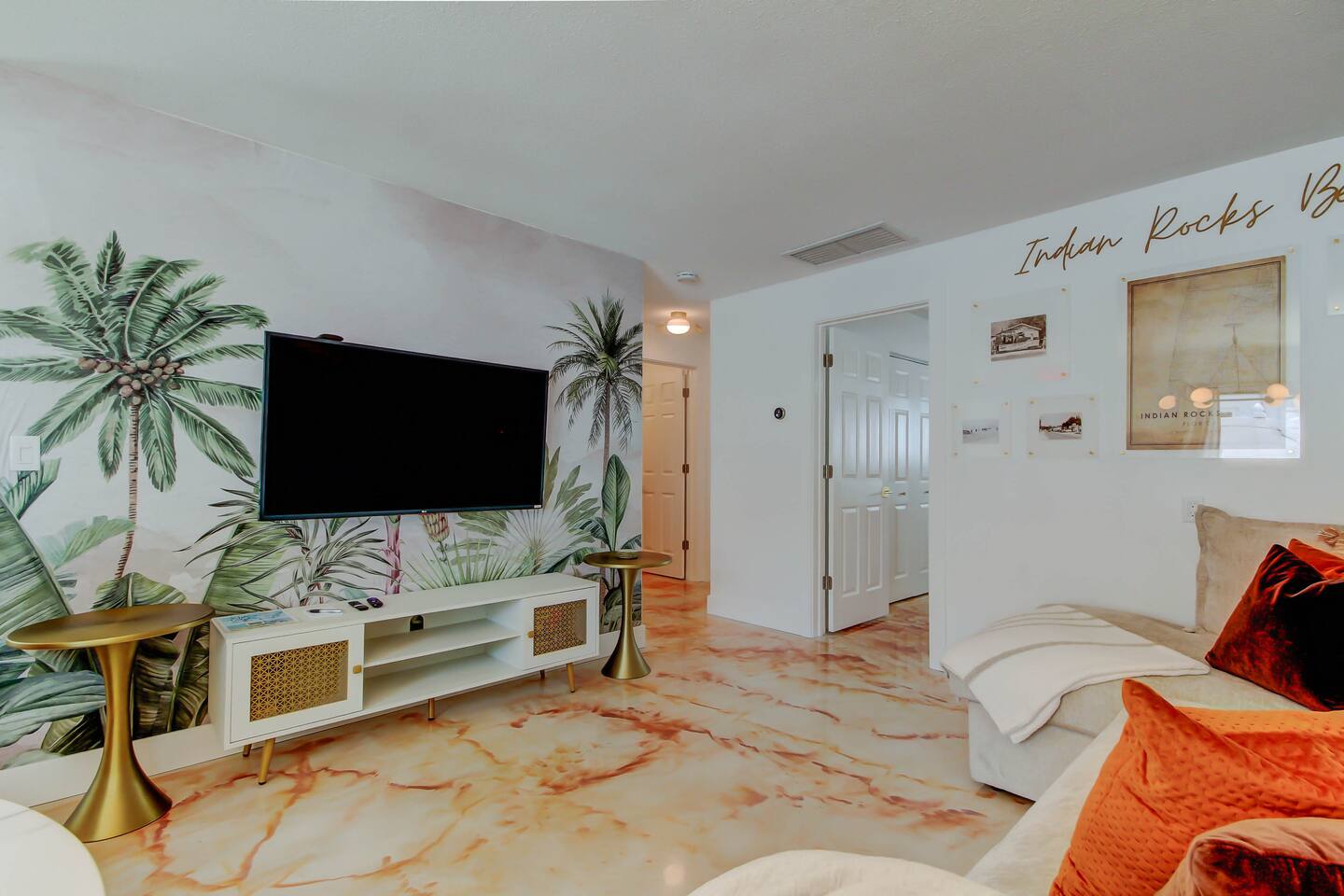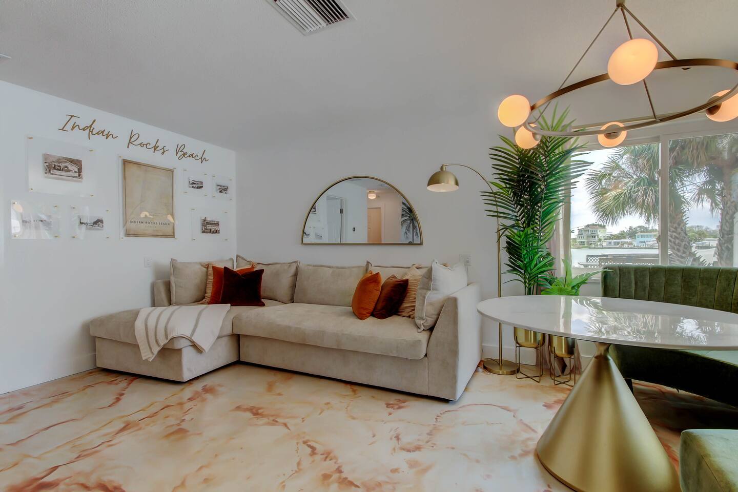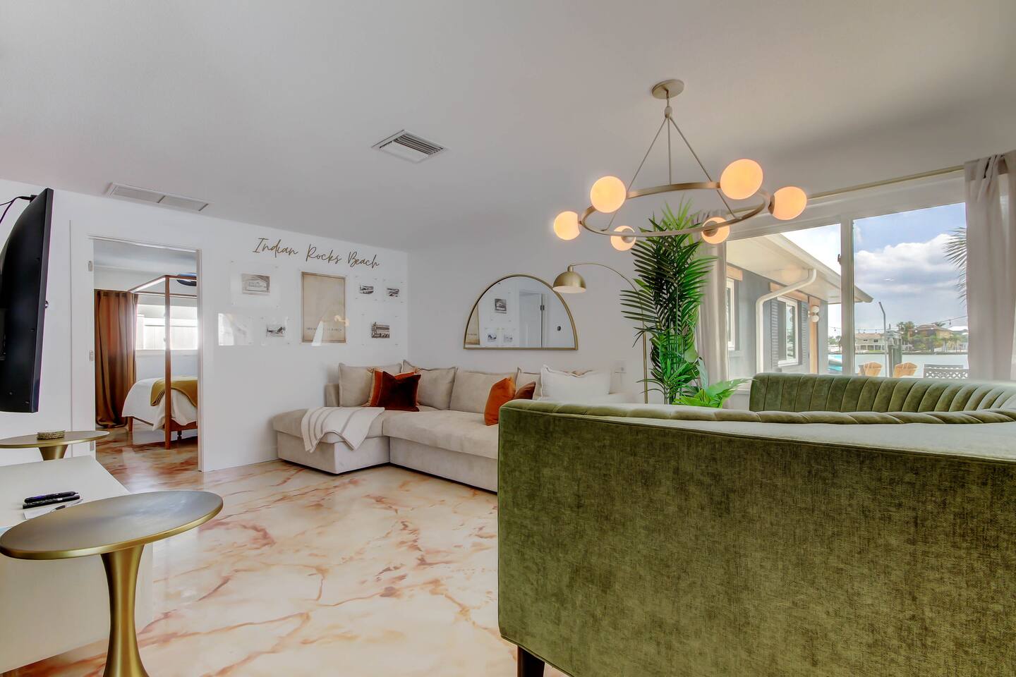 Sunset Suite by My Hometown Hero Rentals Experience waterfront living at its best! Staying at Dolphin Bay on the Rocks offers a luxurious vacation paradise with breathtaking views. As one of two distinct adjacent suites each can sleep up to 6 guests and can be booked independently or together. This listing is for one half of the duplex (private interiors and shared exterior spaces). Spend your days soaking up the sun and breathing in salty air while gazing out onto the bay, or take advantage of the nearby beach access to explore Indian Rocks Beach. For a more contemporary aesthetic, this rental boasts updated furniture and modern epoxy floors; as well as quartz kitchen and bathroom countertops for a touch of luxury. Enjoy an indulgent stay by taking advantage of our extensive coffee bar that includes a Nespresso Vertuo, Keurig, traditional drip coffee maker, frother, coffee grinder with fresh Equal Exchange beans, and french press. No need to leave this spectacular view- even for coffee! Dates not available? Try Sunrise Suite Airbnb902429731161317818. Need to book both suites? Dolphin Bay on the Rocks Airbnb962595161527289151 When you stay in one of our ocean front suites, you'll experience a combination of mid century modern and coastal contemporary design. Each bedroom features a king-sized bed with memory foam mattresses for the utmost relaxation, as well as a designated contemporary workspace so you can work from your vacation destination. The rooms boast eye popping colors paired with luxurious velvet and timeless leather, creating an updated and clean vibe perfect for the modern-day guest. Beach bikes, kayaks, stand-up paddle boards, zero gravity beach chairs, beach wagons, beach towels, bluetooth speaker, and umbrellas are provided for your stay. The sugary sands of Indian Rocks Beach beach is a mere 3 blocks away. Get lost in a beautiful, indulgent escape overlooking the bay with spectacular views. Take a dip in the hot tub and let go of all stress as you relax. Play glow in the dark bocce ball, giant Jenga, ringtoss and cornhole with family or friends. Try your luck fishing off of the dock or venture out in the kayak with one of the provided fishing poles. Allow yourselves plenty of time to fully indulge in an exquisite experience at your beautiful escape overlooking the bay! *Please note ALL exterior amenities are shared with the adjacent duplex. If you would to book both sides of the duplex please see- Dolphin Bay on the Rocks Airbnb962595161527289151 Each side of the duplex has a separate, private entrance and interior spaces are not shared between the suites. KEY FEATURES: ☀ 2 bedrooms with a king-sized memory foam mattress + Smart TV; queen sleeper sofa to accommodate up to six guests ☀ 1 spacious completely renovated bathroom w/ tile shower ☀ Fully-equipped kitchen with high end Caraway cookware and bakeware; dining room table and separate breakfast nook with banquette seating ☀ Leather Chaise in living room; two twin roll away beds available to accommodate up to 6 guests ☀ Oceanview hot tub and chaise loungers; dockside adorandak chairs ☀ laundry room within unit ☀ Free wifi; Smart TVs ☀ Amazon Dots (speakers) with Unlimited Amazon Music, Bluetooth Beach Speakers ☀ Easy access to the beach; less than a quarter mile from property ☀ Includes beach gear: wagons, zero gravity chairs, umbrellas, beach towels, and cooler ☀ Short walk to local seafood restaurants, shops + water sports rentals ☀ unit next door with contemporary coastal design and similar layout can accommodate up to 6 additional guests BTR #2171