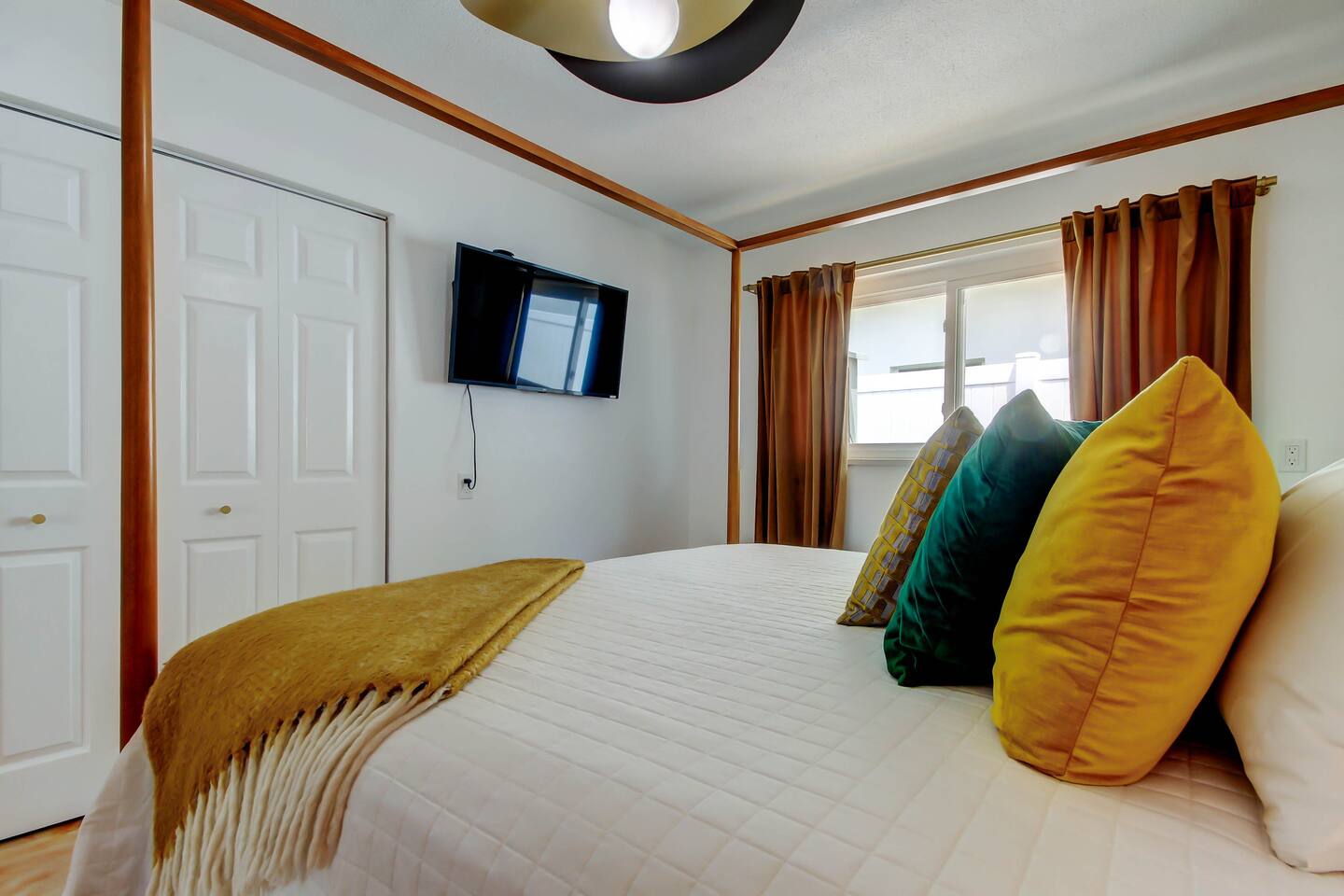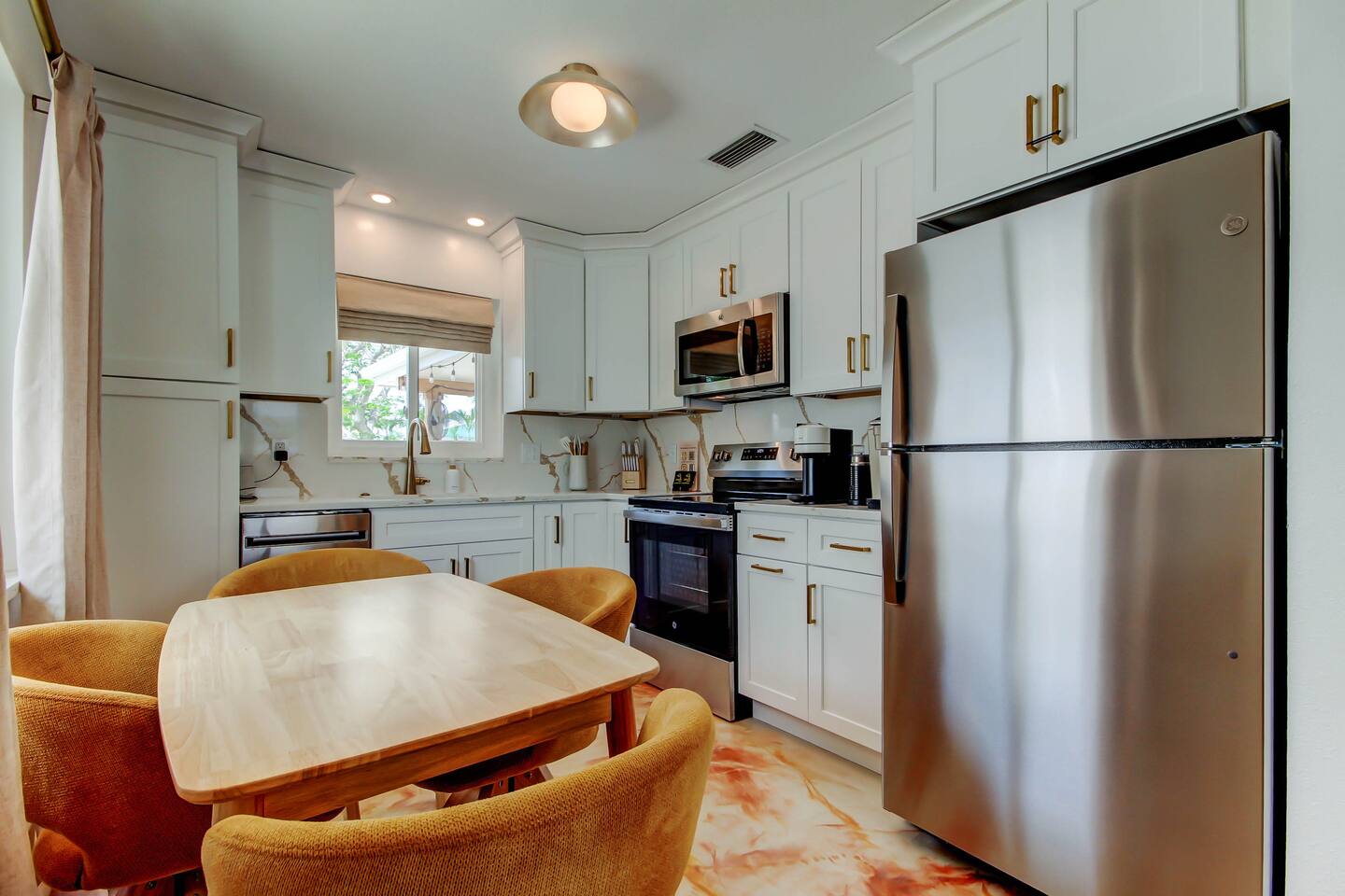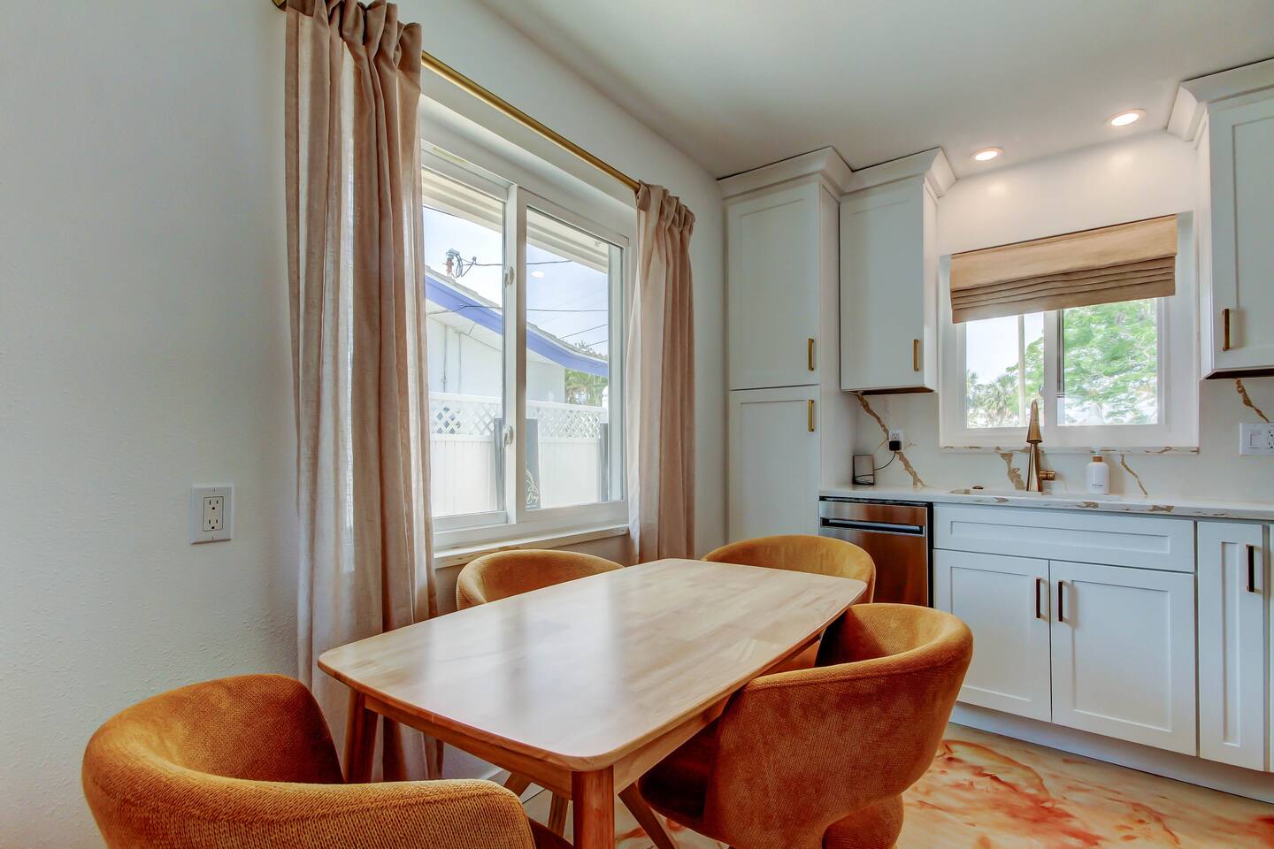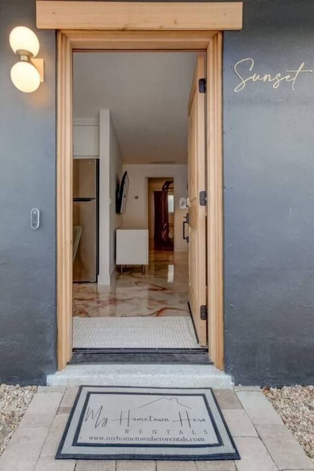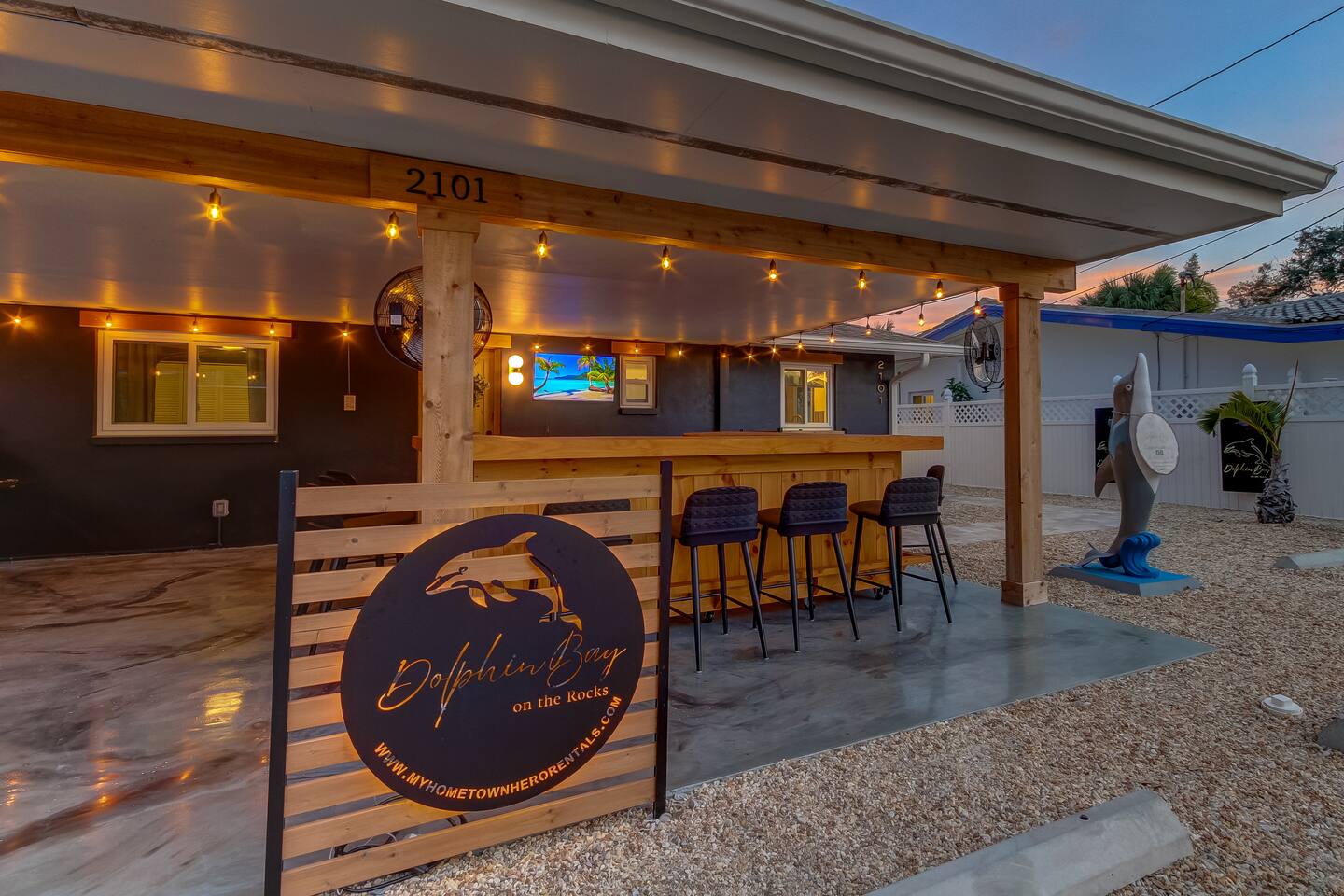 Sunset Suite by My Hometown Hero Rentals Experience waterfront living at its best! Staying at Dolphin Bay on the Rocks offers a luxurious vacation paradise with breathtaking views. As one of two distinct adjacent suites each can sleep up to 6 guests and can be booked independently or together. This listing is for one half of the duplex (private interiors and shared exterior spaces). Spend your days soaking up the sun and breathing in salty air while gazing out onto the bay, or take advantage of the nearby beach access to explore Indian Rocks Beach. For a more contemporary aesthetic, this rental boasts updated furniture and modern epoxy floors; as well as quartz kitchen and bathroom countertops for a touch of luxury. Enjoy an indulgent stay by taking advantage of our extensive coffee bar that includes a Nespresso Vertuo, Keurig, traditional drip coffee maker, frother, coffee grinder with fresh Equal Exchange beans, and french press. No need to leave this spectacular view- even for coffee! Dates not available? Try Sunrise Suite Airbnb902429731161317818. Need to book both suites? Dolphin Bay on the Rocks Airbnb962595161527289151 When you stay in one of our ocean front suites, you'll experience a combination of mid century modern and coastal contemporary design. Each bedroom features a king-sized bed with memory foam mattresses for the utmost relaxation, as well as a designated contemporary workspace so you can work from your vacation destination. The rooms boast eye popping colors paired with luxurious velvet and timeless leather, creating an updated and clean vibe perfect for the modern-day guest. Beach bikes, kayaks, stand-up paddle boards, zero gravity beach chairs, beach wagons, beach towels, bluetooth speaker, and umbrellas are provided for your stay. The sugary sands of Indian Rocks Beach beach is a mere 3 blocks away. Get lost in a beautiful, indulgent escape overlooking the bay with spectacular views. Take a dip in the hot tub and let go of all stress as you relax. Play glow in the dark bocce ball, giant Jenga, ringtoss and cornhole with family or friends. Try your luck fishing off of the dock or venture out in the kayak with one of the provided fishing poles. Allow yourselves plenty of time to fully indulge in an exquisite experience at your beautiful escape overlooking the bay! *Please note ALL exterior amenities are shared with the adjacent duplex. If you would to book both sides of the duplex please see- Dolphin Bay on the Rocks Airbnb962595161527289151 Each side of the duplex has a separate, private entrance and interior spaces are not shared between the suites. KEY FEATURES: ☀ 2 bedrooms with a king-sized memory foam mattress + Smart TV; queen sleeper sofa to accommodate up to six guests ☀ 1 spacious completely renovated bathroom w/ tile shower ☀ Fully-equipped kitchen with high end Caraway cookware and bakeware; dining room table and separate breakfast nook with banquette seating ☀ Leather Chaise in living room; two twin roll away beds available to accommodate up to 6 guests ☀ Oceanview hot tub and chaise loungers; dockside adorandak chairs ☀ laundry room within unit ☀ Free wifi; Smart TVs ☀ Amazon Dots (speakers) with Unlimited Amazon Music, Bluetooth Beach Speakers ☀ Easy access to the beach; less than a quarter mile from property ☀ Includes beach gear: wagons, zero gravity chairs, umbrellas, beach towels, and cooler ☀ Short walk to local seafood restaurants, shops + water sports rentals ☀ unit next door with contemporary coastal design and similar layout can accommodate up to 6 additional guests BTR #2171